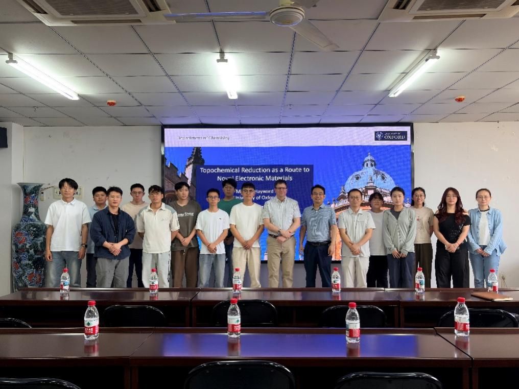 报告会中,Hayward教授重点介绍了其课题组利用拓扑还原反应,阳离子插入反应形成金属-金属键合体系,以及一系列可用于控制拓扑化学阴离子萃取反应的区域选择性、控制还原产物相中长程阴离子间连接性的反应序列等最新研究成果,并与现场师生进行了热烈的学术讨论。通过此次报告会的学习,与会师生不仅对利用对拓扑化学反应,实现复杂过渡金属氧化物中不同金属配位几何及价态的有效调控有了深入的了解,同时对其所展现出有趣物理行为(磁性、电子学、电化学等)有了更为全面的认识。