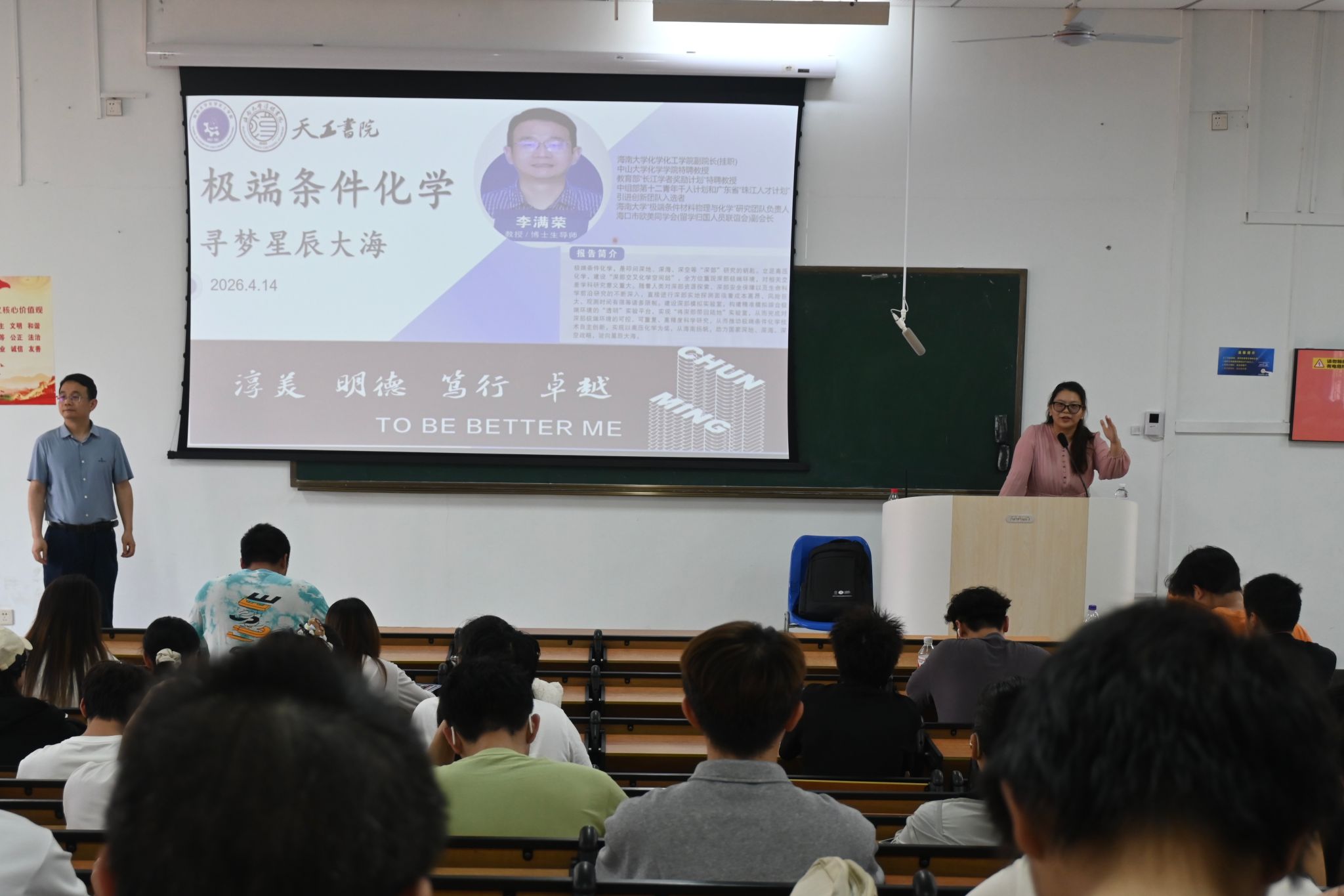 副院长李满荣教授应邀作题为《极端条件化学-寻梦星辰大海》的前沿学术讲座。淳明书院党委副书记武琼主持讲座,淳明书院辅导员钟涛、天工书院辅导员单佳馨与 200 余名米博体育