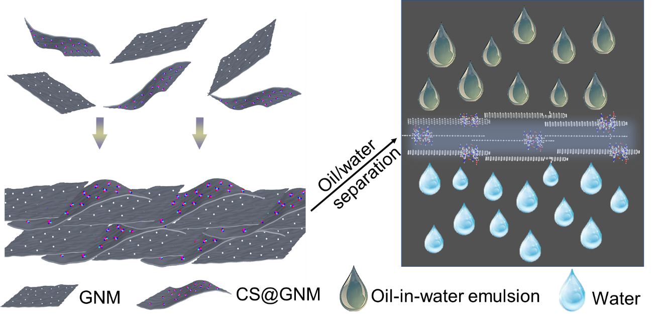 随着工业化进程的加快和全球人口的持续增长,淡水资源严重短缺已日趋严重。含油废水已成为日常生活和食品、皮革、纺织、炼钢、石化等众多行业的主要环境问题。与传统的水处理技术相比,膜技术具有很多优势,包括高选择性、低能耗、简单的设备和低空间需求以及连续和自动化操作,特别是对于有水乳化液的分离上优势明显。氧化石墨烯(GO)具有二维(2D)碳结构和单个碳原子厚度,由于其独特的性质已成为一种流行的膜材料。现有的GO膜中,最关注的是通过在相邻GO纳米片之间插入离子、分子或纳米材料来控制不同层间距达到不同的分离目的,因为层间距在决定GO基膜的分离性能方面起着关键作用。然而,对于石墨烯组装的膜,每个穿过膜的分子都会绕过许多石墨烯片,这延长了分子传质路径增加了传质阻力,从而降低膜的渗透性。