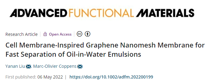 鉴于此,海南大学刘亚楠教授和英国伦敦大学学院(UCL)Marc-Olivier Coppens教授受细胞膜结构(包括具有用于选择性传输的亲水门和用于与水低摩擦的疏水通道的水通道蛋白)的启发,通过真空辅助自组装工艺制备造了一种石墨烯纳米网(GNM)膜。在GO纳米片上构建纳米孔以增加传质通道的数量并降低传质通道长度来制备石墨烯纳米网。结合石墨烯片和水之间的低摩擦,实现了超快速、选择性的水通量。亲水的壳聚糖用于修饰GNM以构建水合层,从而抑制污染物接触膜表面。因此,该石墨烯纳米网膜的渗透通量几乎达到4000 L m-2 h-1 bar-1,约为GO膜渗透通量的260倍。该膜在分离多种表面活性剂稳定的水包油乳液方面表现出优异的防污性能,多种乳液的水通量恢复率均超过96.7%,循环3次后仍保持在95.2%以上。相关工作以“Cell Membrane-Inspired Graphene Nanomesh Membrane for Fast Separation of Oil-in-Water Emulsions”为题发表在国际顶级期刊《Advanced Functional Materilas》上。