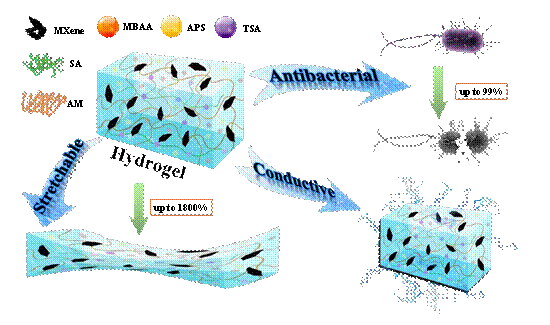 柔性电子设备因其在可穿戴式人体健康监测方面的潜在应用而受到广泛关注。近年来,导电水凝胶在柔性电子器件方面显示出了巨大的应用潜力。然而,二维平面的有限空间限制了MXene传感器的性能,而传统的导电水凝胶缺乏抗菌性能,限制了其在生物医学相关产品中的深入应用。为了克服这些局限性,周阳教授课题组通过丙烯酰胺的自由基聚合,提出了一种具有抗菌导电性的MXene-SA-TSA-AM水凝胶。具体地说,海藻酸钠(SA)和二甲基十六烷基三甲氧基硅丙基氯化铵(TSA)之间的偶联作用使其具有优异的抗菌性能。MXene-SA-TSA-AM水凝胶具有显著的膨胀率(36-38倍)、良好的机械性能(高达1780%)、出色的自愈能力(<10分钟)和可重复粘附性。在压力传感器的应用中,MXene-SA-TSA-AM水凝胶被证明能够准确、快速地监测人体手指弯曲和脉搏的生理活动,具有快速(<0.2s)和高稳定性(最高可达5000次)的特点。此外,MXene-SA-TSA-AM水凝胶具有良好的抗菌性能,对金黄色葡萄球菌和大肠杆菌的抑菌率分别高达99.6%和99.3%。最后,我们期待这种新型的抗菌和导电的MXene-SA-TSA-AM水凝胶将进一步促进柔性电子在生物医学相关产品中的更深层次应用。