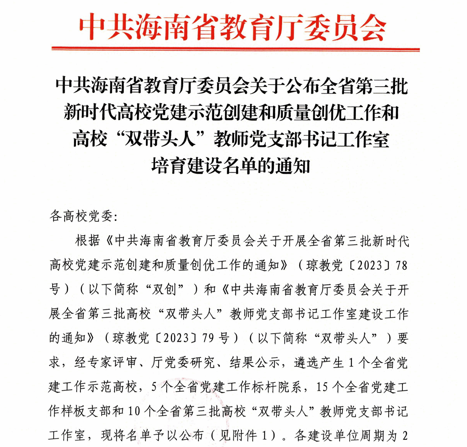 近日,省教育厅委员会公布了全省第三批新时代高校党建示范创建和质量创优工作和高校“双带头人”教师党支部书记工作室培育建设名单,其中第三批全省“双带头人”教师党支部书记工作室培育创建单位10个,米博体育