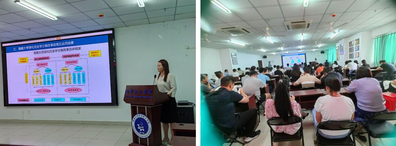 宣讲会上,学校深化完全学分制改革政策宣讲团成员、分管本科教学工作的副书记王小红教授对深化完全学分制改革的意义及各项改革措施做了详细的解读。她指出,全面系统深入推进“三大改革”,是落实全国教育大会精神,深入学习贯彻习近平总书记关于教育重要论述的具体体现;探索深化完全学分制改革海大方案,有利于不断增强学生自主学习意识和学习动力,激发学生创新活力,巩固提升教师人才培养质量意识。本次深化完全学分制改革的核心内容包括完善专业核心课程体系建设、优化选课修课方案和免修免听实施方案、学生课程考核管理方案、实验教学管理方案、改革学生学业考核评价体系、学业审核体系和完善教学工作机制建设等方面。她强调,深化完全学分制改革要加强教风学风建设,努力营造“严谨治学,追求卓越”和“诚实守信,激情探索”的校园氛围,打造“教在海大,学在海大”品牌,要加大宣传力度和考核力度,将教师近三年以第一署名参与教学成果奖、“青教赛”、“教创赛”等教学活动并获校级二等奖及以上或主持完成省级及以上教学研究重点项目作为教师系列职称评审的必要条件,参与教学研究活动作为评优评奖和年度考核重要依据,学业成绩作为学生评价最重要指标。