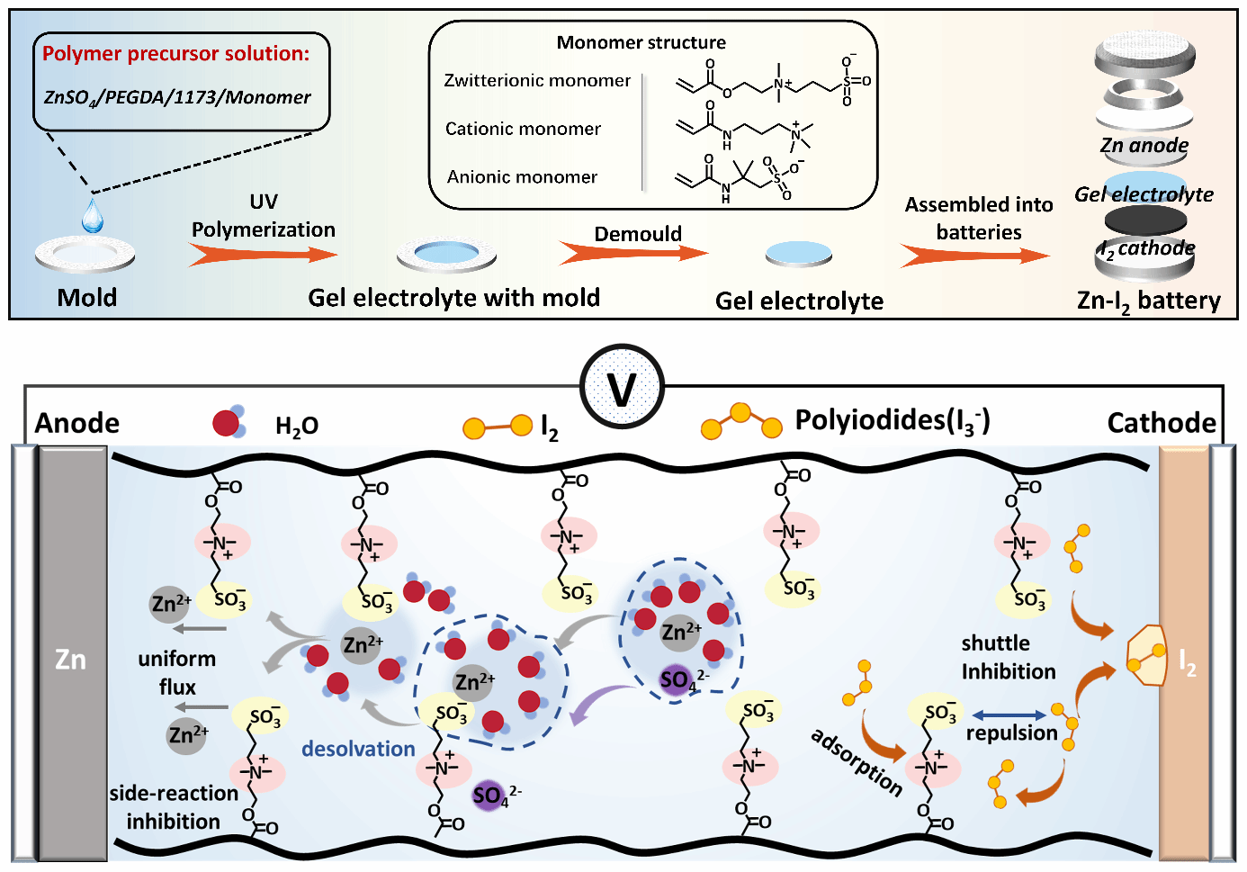水系锌-碘电池因其高安全性、低成本和环境友好性成为储能领域的研究热点。然而,锌阳极面临由水引发的副反应和枝晶生长问题,而电解质中可溶性聚碘化物的严重溶解/扩散则导致活性物质流失和容量快速衰减,限制了电池性能。针对这一难题,研究团队设计了三种典型的凝胶电解质:含阴离子基团(-SO3-)的聚阴离子凝胶(PAG)、含阳离子基团(-N+(CH3)3)的聚阳离子凝胶(PCG),以及同时包含阴离子(-SO3-)和阳离子(-N⁺(CH3)2CH2)基团的聚两性离子凝胶(PZG)。实验与理论计算表明,PAG通过-SO3-基团优化Zn2+传输与沉积,提升阳极稳定性;PCG则通过阳离子基团抑制聚碘化物穿梭效应。而PZG通过阴阳离子基团的协同作用,一方面调控Zn2+溶剂化结构以增强阳极可逆性,另一方面锚定聚碘化物以抑制阴极活性物质流失,形成独特的双功能机制。PZG的Zn2+和聚碘化物的传输路径调控,为解决锌碘电池的循环寿命与容量衰减难题提供了全新思路。最终PZG组装的半电池锌沉积/剥离过程的平均库仑效率高达99.5%,全电池则在10000次循环后容量保持率达96.4%。