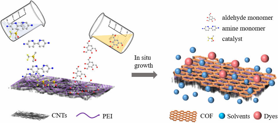 海南大学姜忠义教授团队通过在聚乙烯亚胺修饰的碳纳米管(PEI@CNTs)基底上使用不对称醛单体 2,4,6 - 三酰基间苯二酚(TFR),制备出了一种结晶度增强的COF膜,用于有机溶剂纳滤(OSN)。TFR可通过不可逆的烯醇-酮互变异构同时形成β-酮烯胺键以促进层间堆积,并形成可逆的亚胺键以赋予膜结构优化所需的自修复能力。因此,该COF膜的结晶度得到增强,且表现出高渗透性:水的渗透通量为213.73 L m‑2 h‑1 bar‑1,正己烷为243.70 L m‑2 h‑1 bar‑1,甲醇为134.14 L m‑2 h‑1 bar‑1,截留分子量为601 Da。同时,PEI中丰富的胺基增强了COF膜与PEI@CNTs基底之间的相互作用强度,确保了膜的高机械性能,其拉伸强度为21.52 MPa,杨氏模量为4.16 MPa。海南大学姜忠义教授团队的研究可能为制备兼具高结晶度和高机械强度的 COF 膜提供了一种新颖且简便的方法。