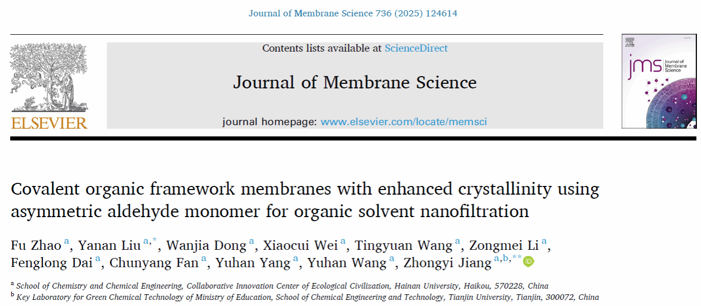 近日,姜忠义教授课题组在期刊《Journal of Membrane Science》(IF = 9.0)发表题为“Covalent organic framework membranes with enhanced crystallinity using asymmetric aldehyde monomer for organic solvent nanofiltration”的研究论文。教育部讲座教授姜忠义教授、海南大学刘亚楠教授为论文共同通讯作者。