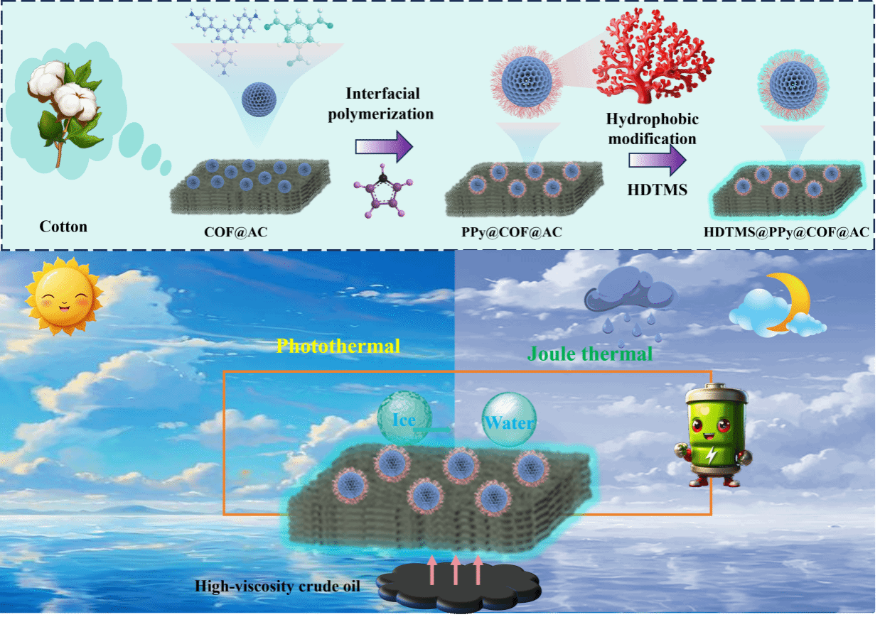 高粘度原油泄漏与寒冷环境结冰是能源与环境领域长期面临的严峻挑战。传统处理技术普遍存在效率低、能耗高、依赖特定天气条件及易造成二次污染等瓶颈。针对上述难题,本课题组提出了一种创新的仿生界面聚合策略,成功构筑了具有珊瑚礁状微纳结构的多功能超疏水涂层(HDTMS@PPy@COF@AC)。该材料通过巧妙的组分设计,实现了共价有机框架(COF)的高导热性、聚吡咯(PPy)的高效光热/电热转换能力与十六甲基二硅氧烷(HDTMS)的低表面能特性的有机融合。研究显示,该涂层具备卓越的超疏水性,水接触角高达152.7°,并对多种油类及有机溶剂展现出优异的吸附能力(10.2-24.8 g/g)和超高的油水分离效率(>99.76%)。其光热-电热双模驱动特性尤为突出:在1.0 kW/m⟡模拟太阳光下,表面温度3分钟内可升至80.8°C;仅施加9V低电压,40秒内即能快速升温至119.2°C,可有效降低高粘度原油的黏度,实现快速吸附与回收。更为重要的是,本研究提出了低能耗协同驱动策略:在0.5 kW/m⟡光照与4.5V电压的协同作用下,材料即可在120秒内高效修复高粘度原油,并在60秒内完成快速除冰,显著提升了能源利用效率。该工作通过仿生结构设计与多功能协同,为开发下一代全天候、自适应、低能耗的海洋溢油处理与表面除冰材料提供了全新的思路与切实可行的解决方案。