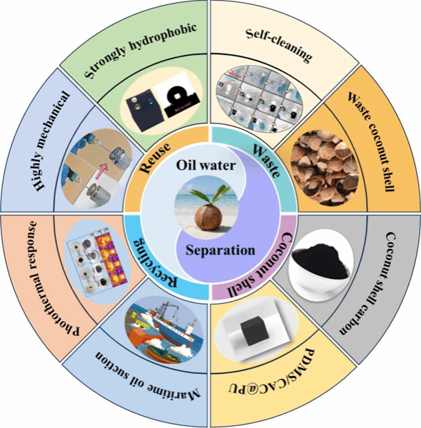 该成果提出了一种将生物质废弃物转化为高性能多功能吸附剂的低成本、环境友好策略。PDMS/CAC@PU海绵在应对海洋溢油和工业含油废水等挑战方面展现出巨大的应用潜力,尤其在自然光照条件下表现尤为突出。