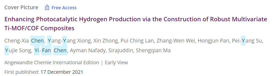 我校化工学院青年教师陈逸凡与美国北德克萨斯大学化学院马胜前教授团队,在国际学术期刊《Angewandte Chemie International Edition》上发表题为“EnhancingPhotocatalyticHydrogenProductionviatheConstruction of Robust Multivariate Ti-MOF/COF Composite”的研究论文(2021年12月17在线发表,doi.org/10.1002/ange.202114071)。海南大学作为第一单位,北德克萨斯大学博士后陈成侠为第一作者,海南大学本科生钟鑫为该论文的第三作者,陈逸凡为该论文的第一通讯作者,北德克萨斯大学马胜前教授为该论文的共同通讯作者。