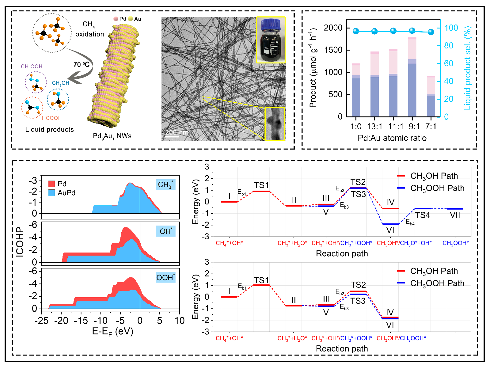 田新龙教授团队将具有不同Pd/Au原子比的PdxAuy纳米线作为模型,系统探讨了反应参数(温度、时间、压力和活性质量等)对甲烷直接氧化制液相C1产物的影响,最优Pd9Au1纳米线的液体C1产物产率和选择性分别为2890.3 mol g-1h-1和99%,在经过多次的稳定性测试循环后,催化剂的活性几乎没有衰减。田新龙教授团队认为这种优异的甲烷直接转化性能归因于具有各向异性、高比表面积、高导电性、快速的质量传输和出色灵活性的一维Pd9Au1纳米线结构以及Pd与Au原子的协同效应。密度泛函理论(DFT)计算表明,具有不同原子比的PdxAuy纳米线可调节自由基(*OH,*OOH,*CH3)吸附强度和PdAu原子之间的键强度,从而显著提高甲烷直接氧化性能。