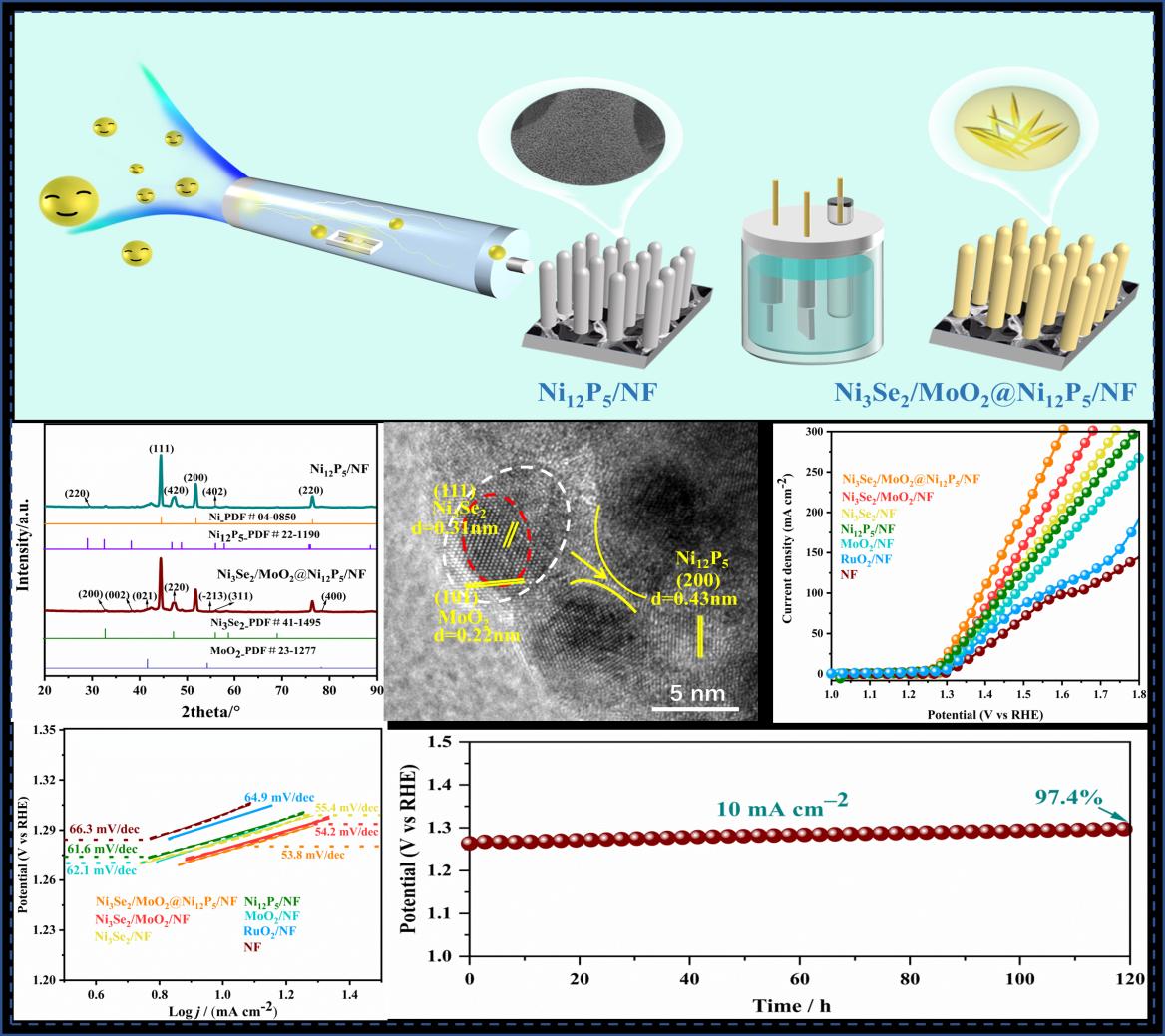 田新龙教授团队提出了一种过渡金属复合催化剂,包括在泡沫镍(NF)基体上原位生长Ni12P5/NF作为前驱体,随后采用快速电沉积方法制备Ni3Se2/MoO2@Ni12P5/NF催化剂。该催化剂具有肖特基空位的分层异质结构,在发生UOR反应,当电流密度达到10 mA cm-2时展现出超低电位1.277 V和53.8 mV dec-1,该性能能够与贵金属基催化剂媲美。此外,经过120小时的耐久性测试,性能保持率为97.4%,证明了具有优异的UOR稳定性。