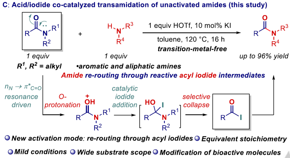 酰胺广泛存在于各类天然的和人工合成的功能分子中,研究酰胺C–N键的活化与转化,对于利用一般酰胺制备精细化学品、实现酰胺类药物等功能分子的晚期修饰和合成具有重要的科学意义和实用价值。由于酰胺C–N键的共振效应,酰胺的化学性质非常惰性,一般只与高活性的亲核试剂如M–H等化合物直接反应。陈铁桥教授团队利用酸与氧配位削弱酰胺键的强度,然后利用强亲核性的碘离子进攻羰基碳,刀剑合璧,在较为温和的条件下实现了惰性酰胺C–N键的在线活化与转氨化,通过活性酰碘的形成重构了酰胺类化合物的经典化学活性顺序,为惰性酰胺C-N键的活化提供了新的策略(图1)。