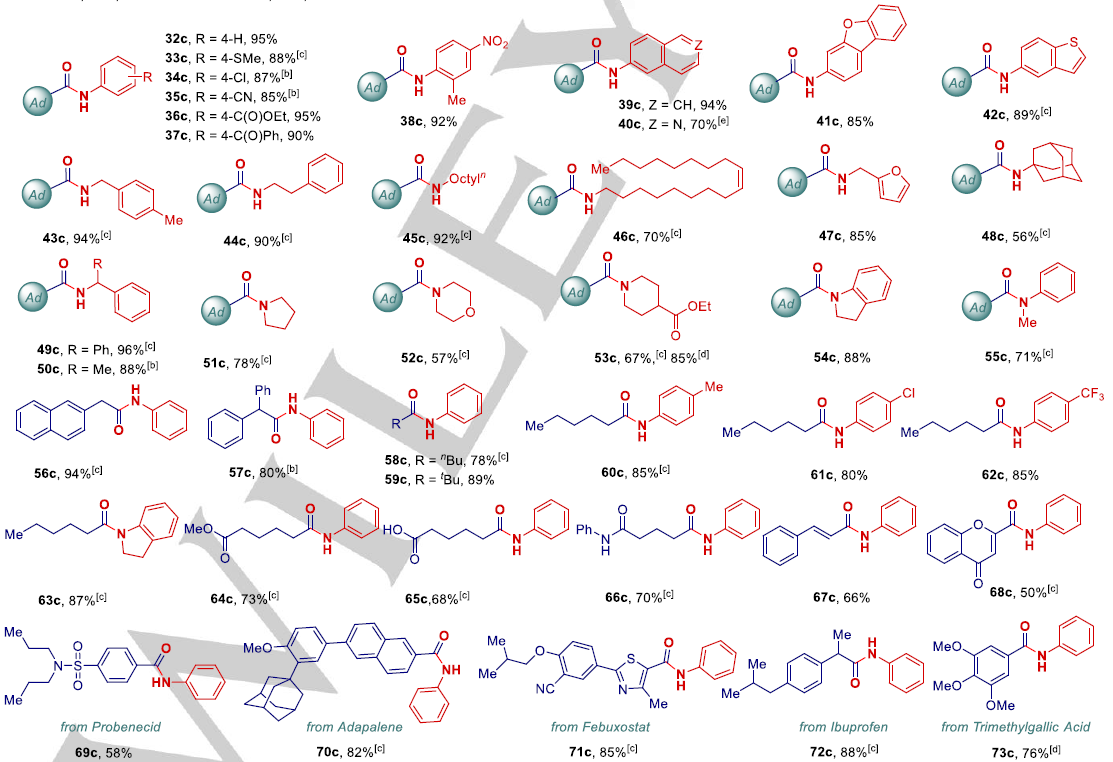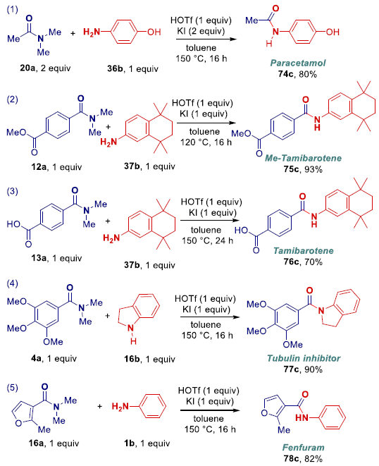 除此之外,该反应能够应用于肉桂酸、4-苯并吡喃酮-2-羧酸、丙磺舒、非布索坦、布洛芬、没食子酸三甲醚多种药物分子酰胺衍生物的晚期修饰;该策略还能够应用于临床药物如扑热息痛(Paracetamol)、他米巴罗汀(Tamibarotene)、微管蛋白酶抑制剂(Tubulin inhibitor)没食子酸酰胺以及种子杀菌剂甲基呋喃酰胺(Fenfuram)的高效合成(图3)。