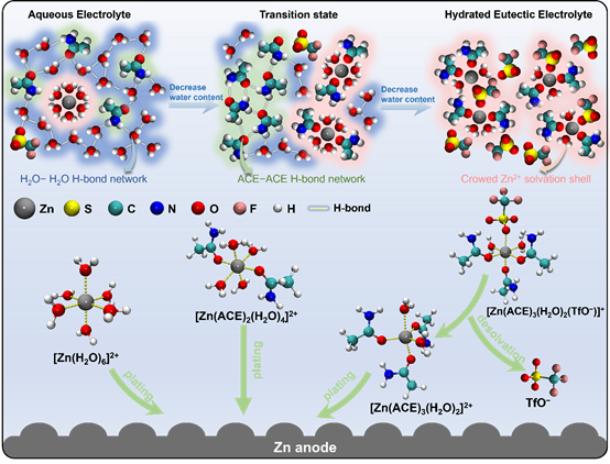在多种优化策略中,水合低共熔溶剂电解液(hydrated eutectic electrolytes, HEEs)由于其自身电化学稳定性高、液态范围宽、高可调性备受关注。与常规水系电解液不同,HEE电解液中锌离子可以通过与氢键供体配位进行溶剂化,从而有效地消除了活性水诱导的副反应。然而,HEE电解液中载流子溶剂化结构的演化路径及其对电极/电解质界面扩散、沉积行为的影响规律尚未有清晰研究。这些科学问题的澄清将有助于HEE电解液在水系锌离子电池中的应用和优化。对此,高新培教授团队系统探究了HEE电解液中载流子溶剂化结构演变与电解质性能间的关联,为开发具有可控溶剂化结构和低成本的HEE电解液提供了详实的理论依据。该成果以“Microstructural Evolution of Zinc-Ion Species from Aqueous to Hydrated Eutectic Electrolyte for Zn-Ion Batteries”为题在化学与可持续发展领域TOP期刊ChemSusChem(IF=9.14)发表,并被编辑和审稿人推荐为Very Important Paper.