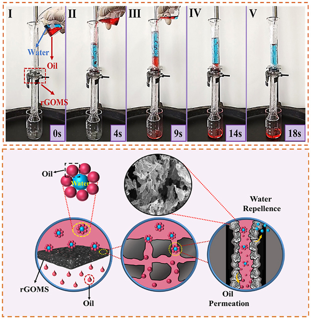 高助威副教授课题组将氧化石墨烯片负载在三聚氰胺海绵上。通过化学还原方法构建了具有超疏水/超亲油表面结构的还原氧化石墨烯涂层三聚氰胺海绵(rGOMS)。通过吸附和过滤试验,对rGOMS的油吸附性能和油水分离性能(主要针对普通油水混合物和油包水乳液)进行测试。此外,还连接蠕动泵搭建了连续油水分离装置并对rGOMS连续分离油水的性能进行了分析。有望能为大型连续油水分离装置的关键部件的大规模生产和工业应用提供参考。