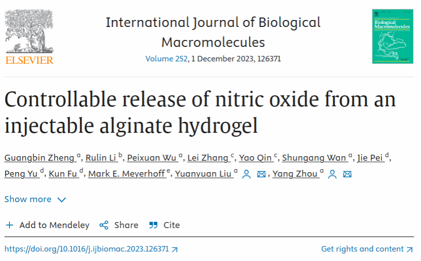 近期,海南大学化学工程与技术学院周阳教授课题组与海南医学院第一附属医院付昆教授和美国密西根大学Mark Meyerhoff教授共同在中国科学院1区国际权威Top期刊《International Journal of Biological Macromolecules》(影响因子:8.025)上发表了最新研究成果 “Controllable Release of Nitric Oxide from an Injectable Alginate Hydrogel” (可注射的海藻酸盐水凝胶可控释放一氧化氮)。海南大学为第一单位,海南大学2021级硕士研究生郑光斌为论文的第一作者,该工作获得了海南省科技合作专项国际科技合作研发项目基金和国家自然科学基金的支持。