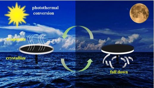 随着全球人口的不断增长和工业化进程的加快,淡水资源短缺问题已经成为全球面临的重要挑战之一,因此采用太阳能海水淡化有望解决水资源缺乏的问题。本研究报道了一种将MWCNTs负载在滤纸上,以棉线作为水通道组装成MWCNTs圆盘蒸发器(MCED),0.7-MCED在一个太阳光强下的蒸发率可达到1.3134kg/m2h;同时,0.3-MCED经过7天的蒸发循环,在光照下,盐结晶于MCED边缘,黑夜时受重力脱落回收,淡水收集率和盐回收率分别为0.82 kg m−2 h−1和38.24g m−2 h−1,实现高效连续的水收集和盐回收。另外,MCED能通过水蒸发产生电压。这项工作展示了一种可用于连续海水淡化以及盐回收和发电的太阳能蒸发器,为MWCNTs的光热调制设计和解决太阳能海水淡化的盐结晶问题提供了新的方向。