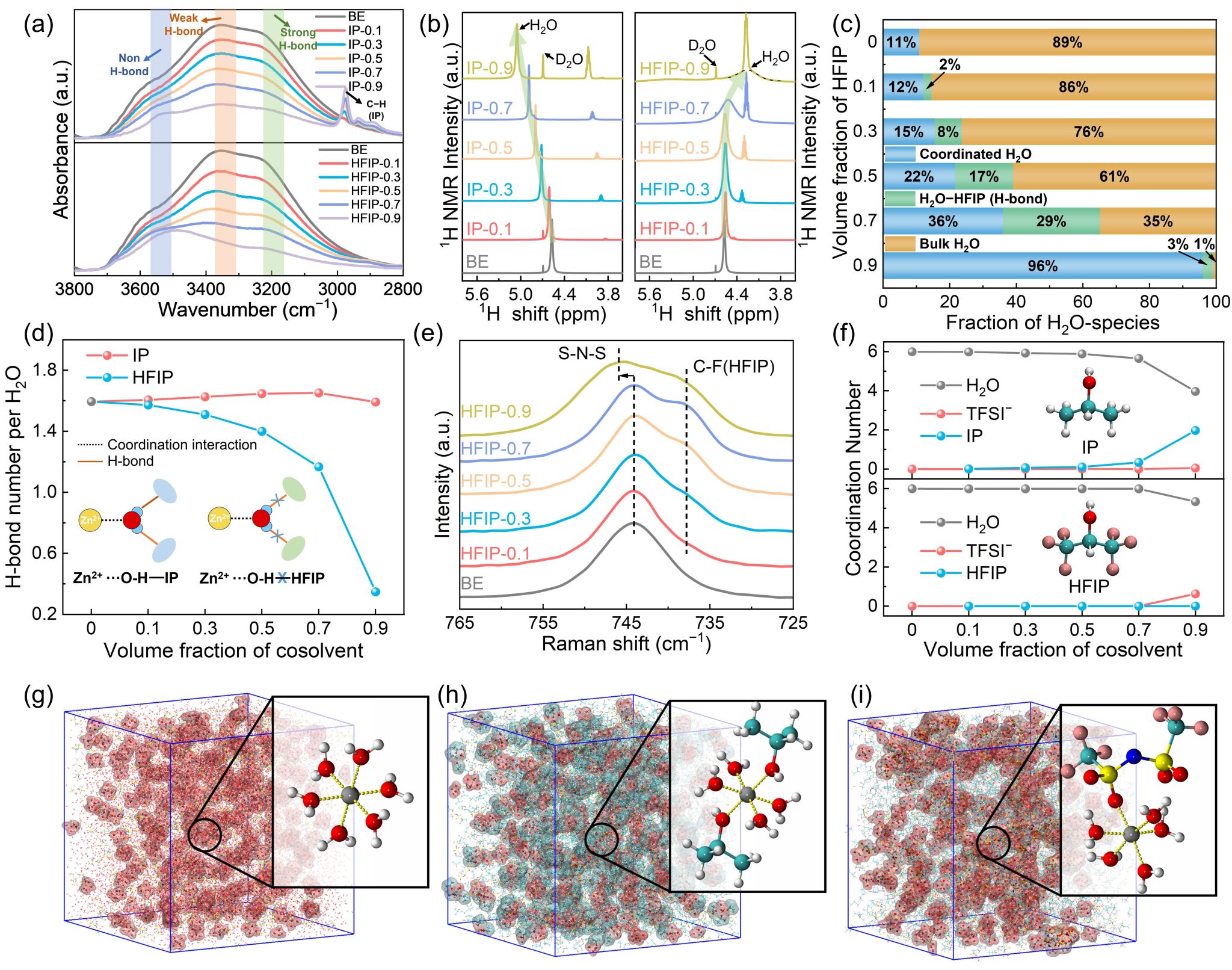 基于以上背景,海南大学高新培教授和宁德时代21C实验室欧阳楚英教授合作提出了引入潜溶剂来构建含阴离子的溶剂化结构的策略,以提高水系锌电池中锌负极的稳定性。通过理论计算辅助,在多种溶剂中筛选到了六氟异丙醇(HFIP)作为调控电解液微观结构的理想潜溶剂。HFIP具有亲阴离子和疏阳离子的特性,当HFIP与Zn(TFSI)2、H2O构筑三组分电解液时,Zn(TFSI)2盐就具有了典型的双亲性特点,Zn2+阳离子亲水而TFSI−阴离子亲HFIP。在该双亲性特点的作用下,Zn(TFSI)2盐在水中的溶解度由5.4 M增加至20.6 M。盐浓度的提升使得阴离子进入锌离子溶剂化结构成为可能,并诱导其在循环过程中优先分解,在锌负极表面形成了阴离子衍生的固体电解质层。此外,阴离子与阳离子的直接相互作用还改变了锌离子的脱溶剂化路径,实现了还原过程的逐步脱水,这极大的减少了锌负极对水的吸附,进一步抑制了副反应的发生。因此,阴离子衍生的固体电解质层和优化的脱溶剂化路径协同作用,实现了锌的均匀沉积,并提高了电极的循环可逆性。当与NaV3O8-1.5H2O(NVO)正极结合使用时,所组装的全电池在1 A g-1的条件下经过2000次循环后可达到87.8%的高容量保持率,证明了潜溶剂策略在电解液优化方面的潜力。该成果以“Latent Solvent Induced Reliable Interfacial Chemistry Toward Highly Reversible Zn Anodes”为题在国际知名期刊Advanced Energy Materials上发表。