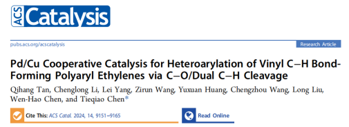 近日,陈铁桥教授团队在中国科学院一区Top期刊《ACS Catalysis》(IF = 12.9)发表题“Pd/Cu Cooperative Catalysis for Heteroarylation of Vinyl C–H Bond Forming Polyaryl Ethylenes via C–O/Dual C–H Cleavage”的研究论文,海南大学2019级博士研究生谭启航为论文第一作者,陈铁桥教授为论文的通讯作者。