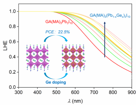 研究成果发表于国际著名期刊《Journal of Materials Chemistry A》(IF=10.7)上,题为“Germanium doping effect on the photoelectronic performance of alternating cations in the interlayer space GA(MA)3(Pb1−xGex)3I10”。第一作者为米博体育(中国)官方网站
