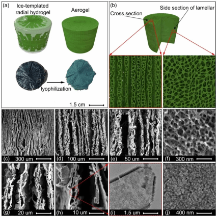 环境/能源材料先进制造与应用创新团队高艳安研究员、巫继锋副教授与厦门大学白华教授团队合作,设计了一种纯聚苯胺水凝胶(PPH)电极材料。该材料通过冰模板策略生成独特的辐射多孔状结构,实现了高效的电子传递和电解质扩散,成功桥接了超高质量负载和优越的速率能力这两个相互排斥的特性。PPH在43.2 mg/cm²的高质量负载下,实现了17.1 F/cm²的面积电容(在500 mA/cm²下)和优异的倍率性能(在20至500 mA/cm²间保持约94%的电容)。这项研究展示了多孔纳米结构在提高电极材料性能方面的潜力,并能激发其他具有超高负载和快速充放电能力的赝电容电极材料的发展。