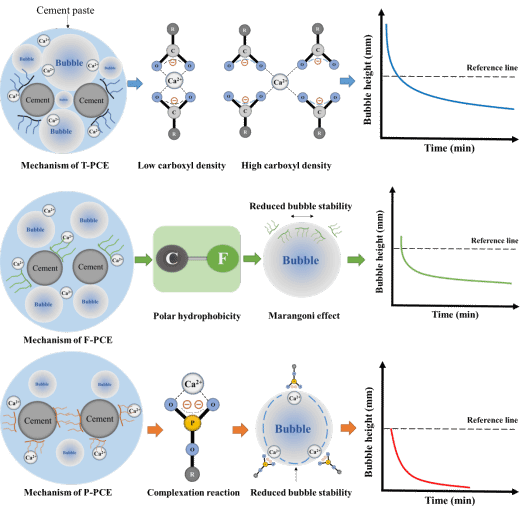 引入HFBMA和HEMAP等功能单体后,PCE的分散性能得到明显提升,引气性能得到抑制,尤其是P-PCE表现良好分散性能、吸附能力以及较低的引气性能。并阐明了作用机制,如图3所示:T-PCE的表面活性较强,具有较强的发泡能力和气泡稳定性,T-PCE以4个-COOH和1个钙离子(Ca2+)的形式发生络合,游离Ca2+浓度较高,所以T-PCE的引气性较强;F-PCE上的C-F键具有疏水性,通过马兰戈尼效应急剧降低了表面张力,有利于消泡,所以F-PCE的引气性较T-PCE低;P-PCE上的磷酸根(-OPO32-)带有2个负电荷,更容易吸附在水泥颗粒上和Ca2+络合,降低游离Ca2+浓度,削弱了气泡稳定性。