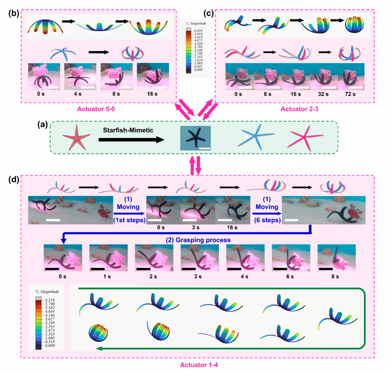 图6. 基于同一FLH构筑的“仿生海星”及其不同编程的3D初始形状和不同的3D多步复杂仿生形变。(a)海星的实物图和前后示意图;(b)驱动器5-0的捕食过程(所有五条“腿”都在向下弯曲);(c)驱动器2-3的捕食过程(两条“腿”处于向下弯曲,并且三条“腿”处于向上弯曲);(d)驱动器1-4的爬行和捕食。(一条“腿”向下弯曲,四条“腿”向上弯曲)。