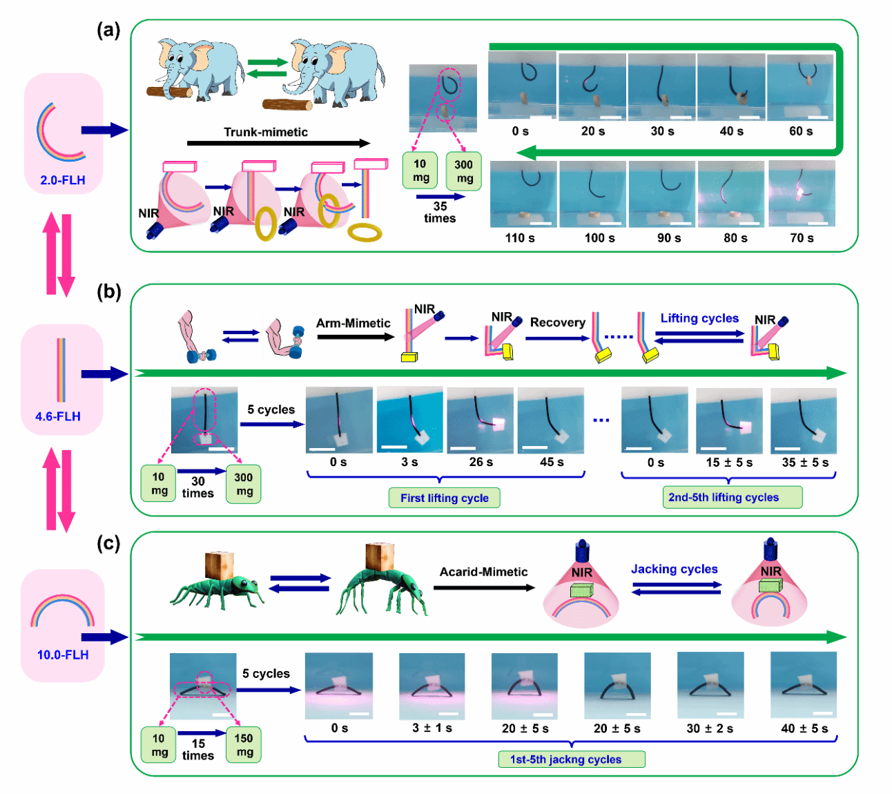 图3. FLH的初始形状可重新编程性和相应的光热响应驱动性能