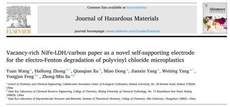吸附与催化材料团队在Journal of Hazardous Materials上发表题为“Vacancy-rich NiFe-LDH/carbon paper as a novel self-supporting electrode for the electro-Fenton degradation of polyvinyl chloride microplastics”的研究工作。米博体育