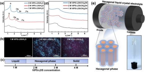 此外,团队利用表面活性剂自组装策略构筑了一种具有六角相态的液晶电解质,该液晶电解质在有序自组装结构下,能构建高效离子传输通道,实现高离子电导率。同时,其自支撑特性赋予了电解质良好机械性能,可解决液态电解质易泄露的缺陷。实验显示,基于六角液晶电解质的水系锂离子电池,展现出良好的循环稳定性,在多次充放电循环后,仍具有较高的容量保持率。相关成果以“Hexagonal liquid crystals as emerging quasi solid-state electrolytes for aqueous lithium-ion batteries”为题发表于Chemical Engineering Journal(DOI: 10.1016/j.cej.2024.157794, 第一作者是硕士研究生任韦蓉,通讯作者是苏龙副研究员、山东大学郑利强教授、鲁飞教授。